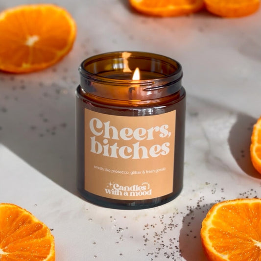 Lumânare parfumată din ceară de soia CHEERS BITCHES amber - sweet orange - patchouli 100g