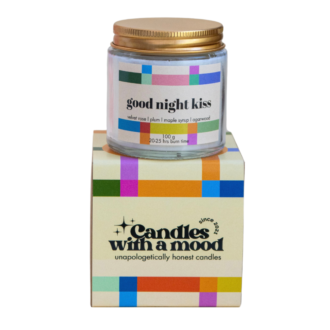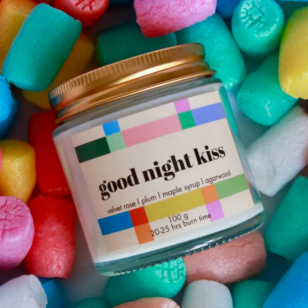 This soy candle's unique blend of velvet rose, plum, maple syrup, and agarwood creates a good night kiss scent that's as sweet as love can be. Light it to relax and fill your home with the warmth and comfort of a loving embrace.
